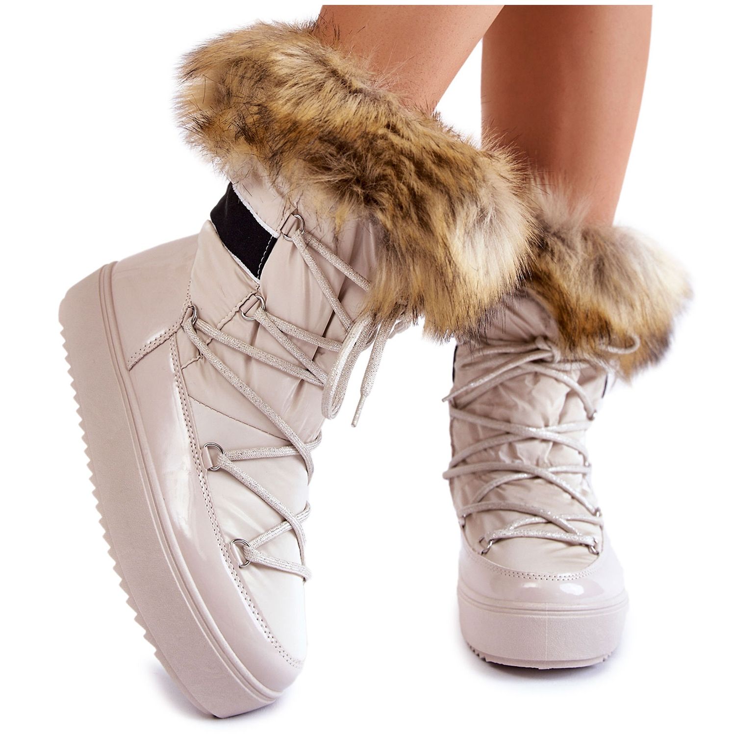 Detalhes: Botas de neve femininas Shannon bege com cadarço e pele