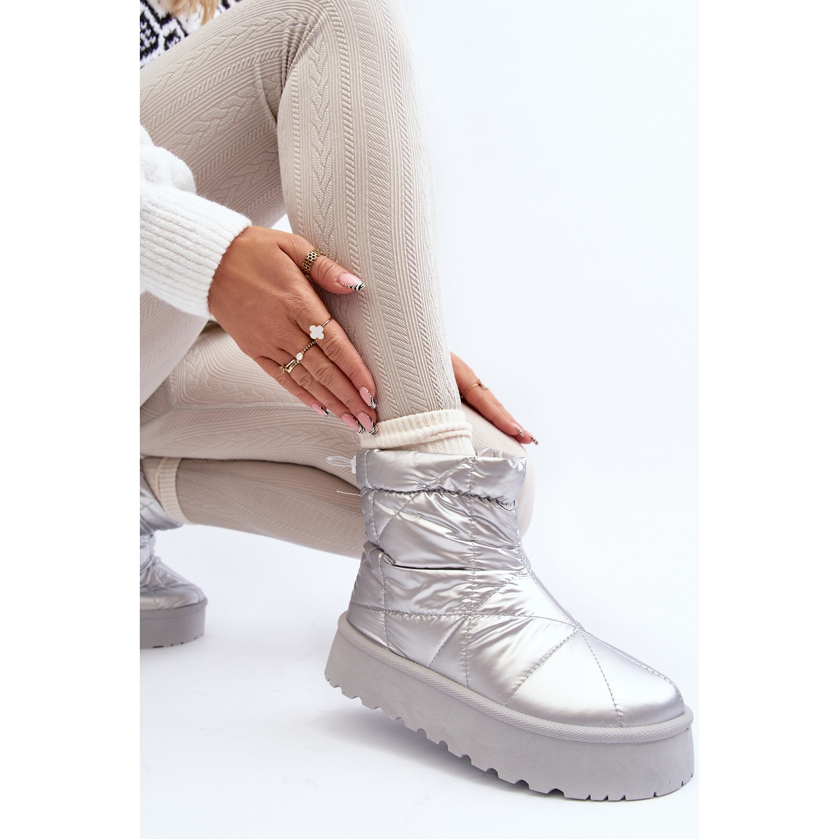 Detalhes: Botas de neve femininas Silver Fionia em uma plataforma enorme prata