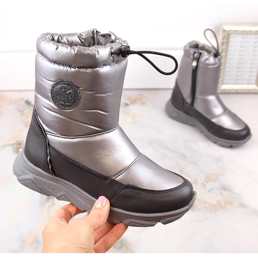 Botas de neve das meninas à prova d'água Kornecki 6916 - Prata, que combinam estilo e funcionalidade. Perfeito para os dias de inverno - um visual brilhante e prateado com acessórios pretos combina bem com trajes casuais e mais elegantes. Modelo da coleção Black Friday 2024.