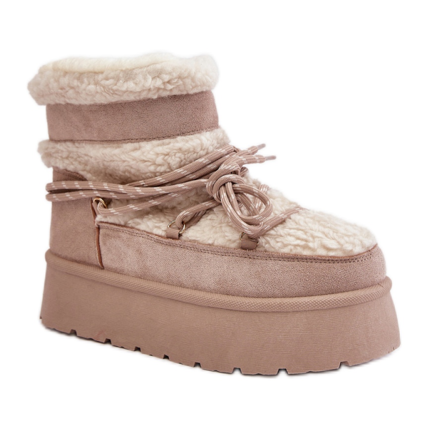 Uma característica distintiva das botas de neve é a encadernação frontal da moda, que não apenas adiciona caráter, mas também permite um ajuste preciso ao pé. O interior isolado de pêlo macio garante que seus pés sempre estejam quentes, mesmo a baixas temperaturas. Graças à elevada 16 cm de altura e uma plataforma de 5 cm de altura, essas botas de neve protegem perfeitamente contra o frio e a umidade, além de adicionar alguns centímetros à sua altura.