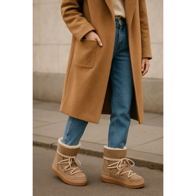 Para os fãs do estilo boho e dos materiais naturais, as botas de neve como Inuikii ou UGG serão perfeitas. Confeccionados em pele de carneiro, amarrados com cadarços grossos, combinam perfeitamente com casacos de lã e jeans mom fit. Nesta temporada predominam os modelos em tons de bege, caramelo e chocolate. Eles são incrivelmente quentes e confortáveis - é como caminhar sobre uma nuvem, mesmo quando está muito frio lá fora.