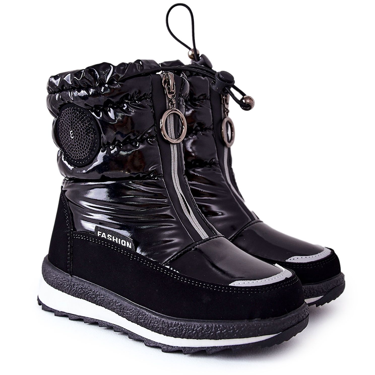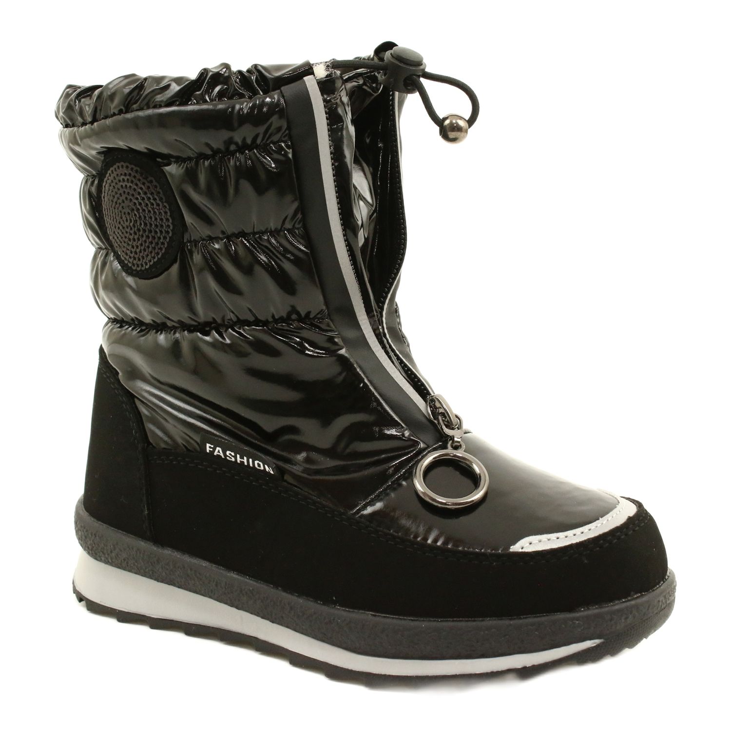Confeccionadas em couro ecológico e náilon envernizado, as botas de neve encantam com um atraente padrão de lantejoulas em formato de círculo, o que as torna não só funcionais, mas também elegantes nos pés das crianças. Proteção adicional em forma de capa costurada e lingueta de fole no zíper protege contra neve que cai dentro do calçado, o que é extremamente importante durante a diversão de inverno.