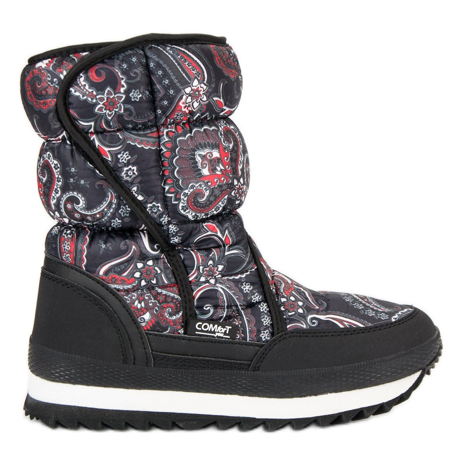 Confeccionadas em material têxtil de alta qualidade, as botas de neve distinguem-se por um padrão original que combina cores clássicas - preto, branco e vermelho - num atraente motivo floral e geométrico. Graças à sola elevada, que chega a 3 cm de altura, e ao isolamento em pele macia, os seus pés ficarão perfeitamente protegidos do frio e da humidade, o que é especialmente importante durante as longas caminhadas de inverno.