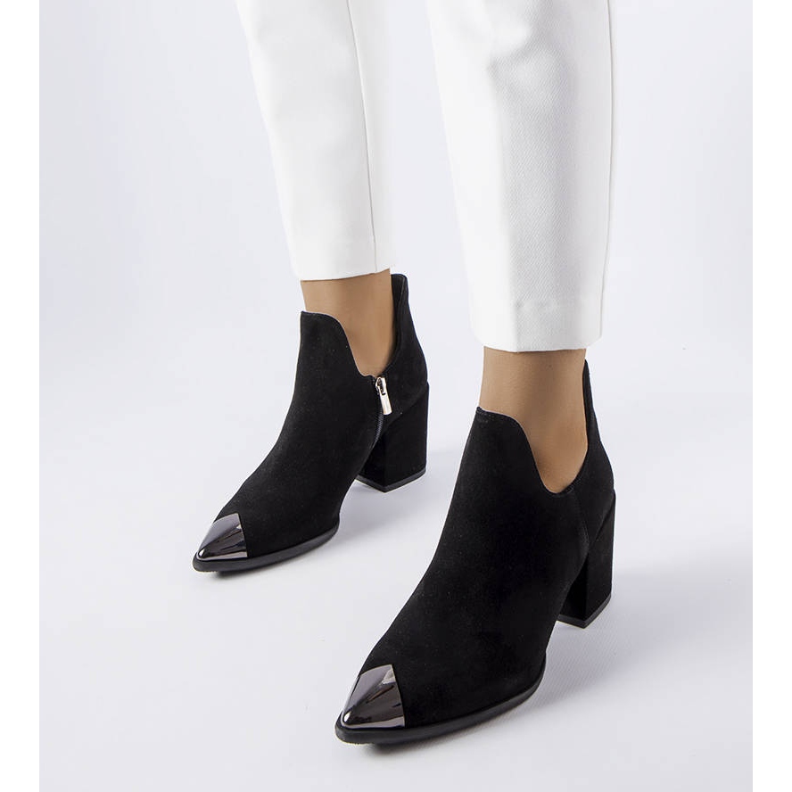 Botas de Karino de couro preto - elegante, confortável e pronta para os desafios do dia a dia. Feito de couro natural de camurça, eles alcançam o tornozelo e apresentam um elegante corte de cowboy com um nariz pontudo moderno decorado com uma inserção de metal prateado. O calcanhar do tipo de loda baixa com uma altura de 7 cm garante estabilidade e silhueta feminina, e o zíper por dentro facilita a instalação.