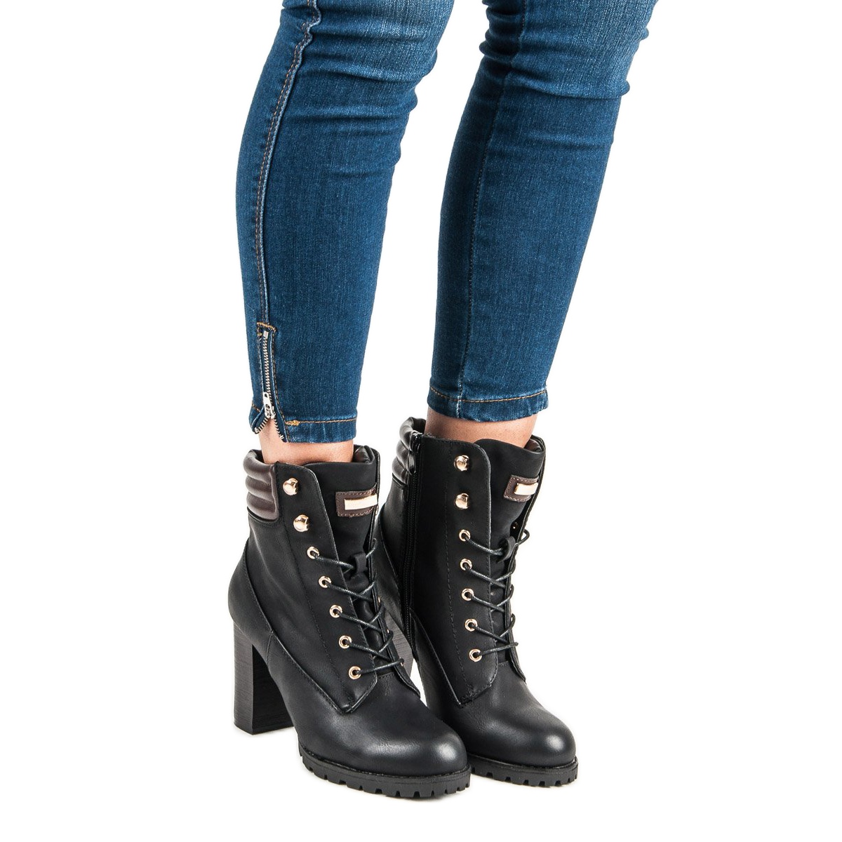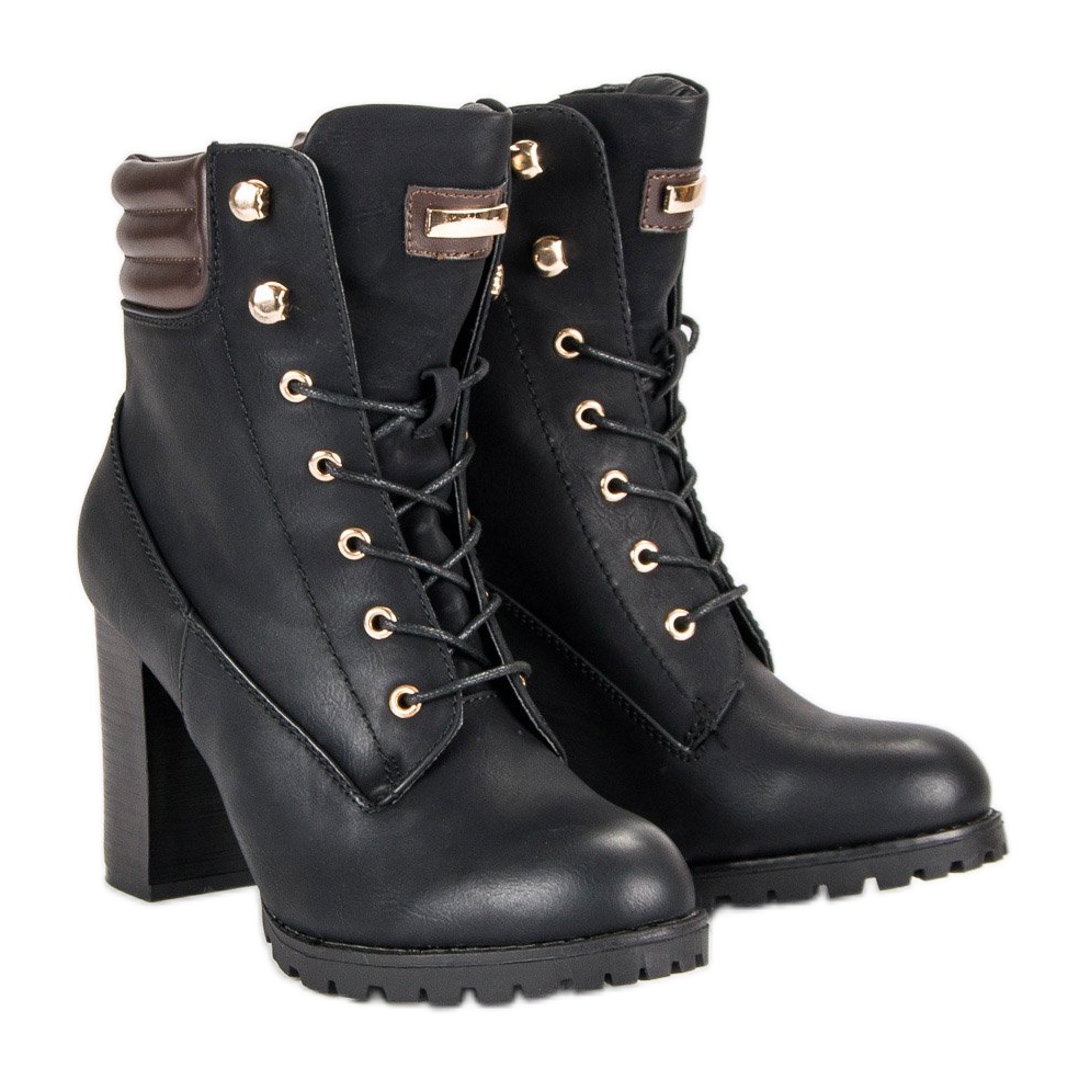 Descubra a elegância com botins de salto alto KAYLA na clássica cor preta. Estes sapatos estilosos, decorados com detalhes em marrom e dourado, são perfeitos tanto para estilos casuais quanto mais elegantes. Possuem haste de 9 centímetros que confere elegância, além de zíper e cordões delicados que facilitam a colocação.