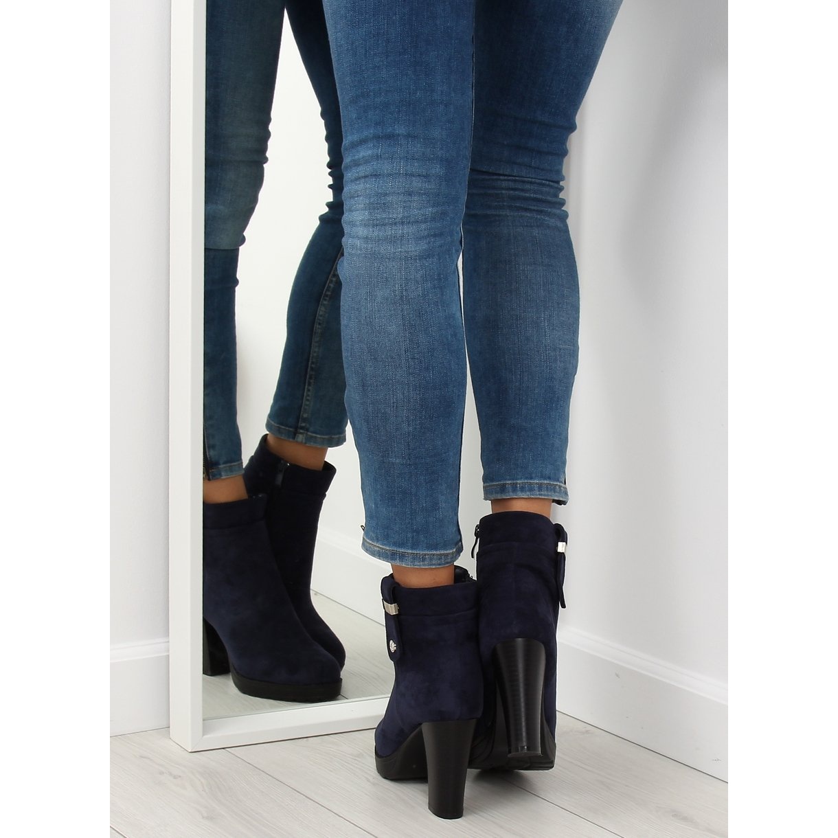 Descubra os exclusivos botins femininos BK3233 na elegante cor azul marinho, que serão um complemento perfeito para o seu guarda-roupa. Fabricados em camurça ecológica de alta qualidade, combinam design moderno e conforto de uso. Graças ao salto reto de 9,5 cm, estes sapatos não só alongam as pernas, mas também acrescentam graça ao seu corpo.