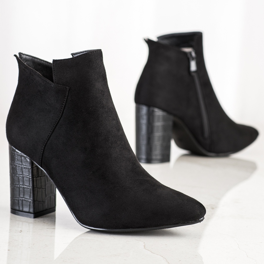 As botas são confeccionadas em couro camurça ecológico de alta qualidade, o que garante não só estética, mas também conforto de uso. A sua cor preta faz com que combinem com vários estilos, independentemente da ocasião. O calcanhar reforçado e o isolamento garantem conforto e estabilidade adequada ao caminhar.