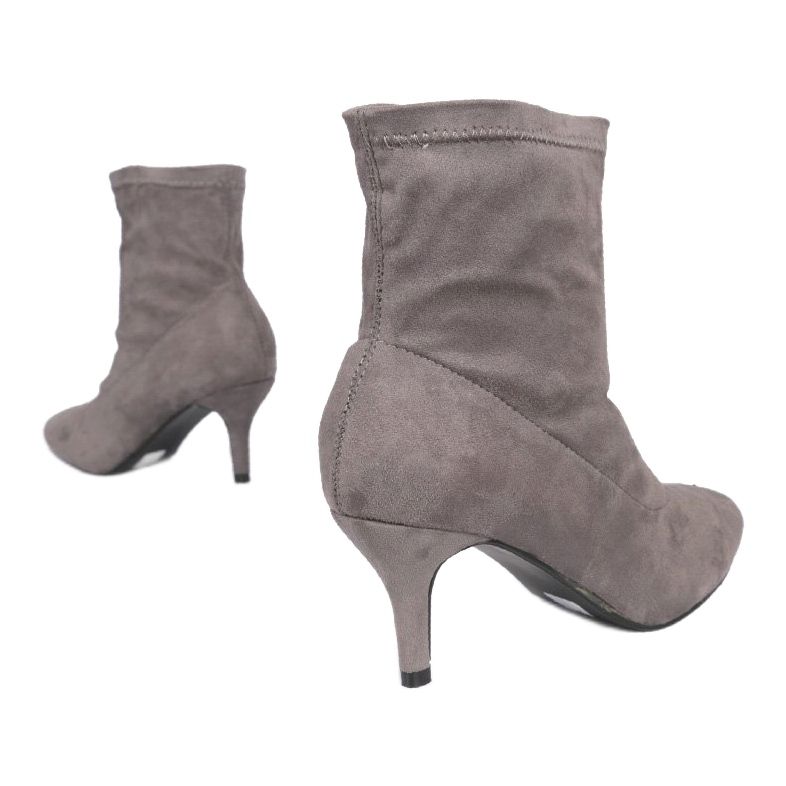 Descubra elegância e estilo com os botins de salto alto cinzentos F183, que são o complemento perfeito para o guarda-roupa de qualquer mulher. Estes botins cinza, confeccionados em camurça ecológica de alta qualidade, encantam não só pela aparência, mas também pelo conforto de uso. A ponta pontiaguda confere-lhes um formato esbelto que realça perfeitamente a figura.