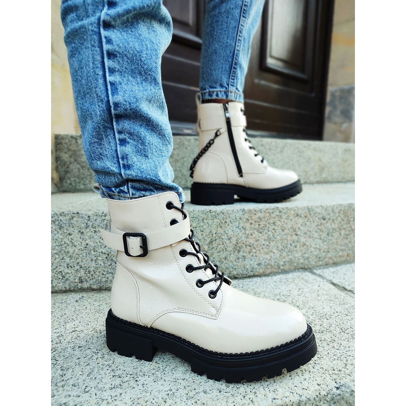 Trabalhadores elegantes feitos de couro ecológico envernizado em uma cor bege universal. Um modelo que combina um caráter militar cru com uma nota feminina graças a uma superfície brilhante e uma cadeia decorativa e destacável. Perfeito para dias mais frios - isolados, tornozelo, confortável e fácil de ajustar, graças ao laço e um zíper.