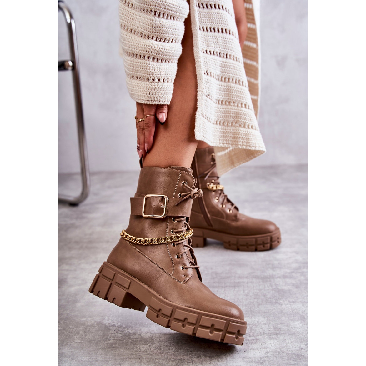 Fechados com zíper lateral e amarrados, oferecem não só uma aparência estética, mas também conforto na compra e no uso. Uma vantagem adicional é a alça ajustável com fivela, que realça perfeitamente o caráter fashion do calçado. Uma corrente decorativa fixada na parte superior acrescenta um estilo único e um toque moderno.