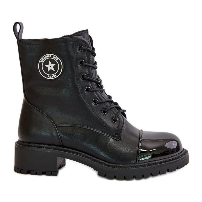 As botas têm um nariz redondo e um salto plano de 4 cm de altura, o que os torna a escolha ideal para mulheres que valorizam o estilo e o conforto. A inserção de tecido construída aumenta ainda mais o conforto do uso. Graças à superfície envernizada, essas botas se destacam de outros modelos, atraindo os olhos com a elegância.