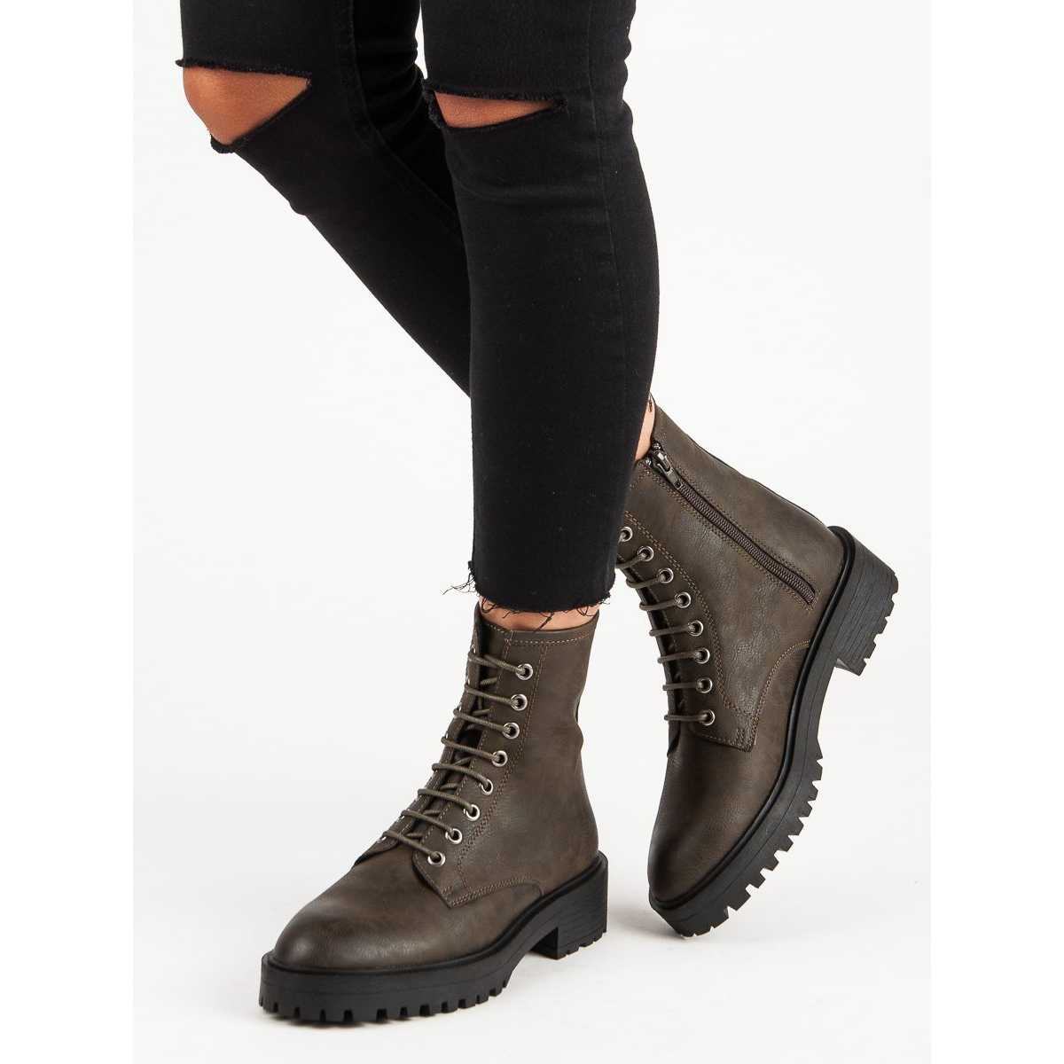 Feitos de couro ecológico de alta qualidade, os trabalhadores cáqui escuros combinam perfeitamente com o estilo outonal. Seu design universal faz com que combinem com muitos looks diferentes - de jeans e suéteres a vestidos, acrescentando um toque de estilo a cada look.