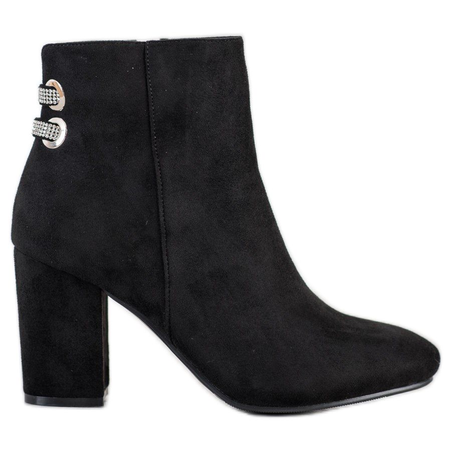 SHELOVET Botins Elegantes Com Zircônias Cúbicas na cor preta é um modelo único que encanta com elegância e estilo. Confeccionados em couro camurça ecológico de alta qualidade, esses botins combinam estilo e conforto. A parte superior, que chega acima do tornozelo, é sutilmente decorada com duas listras com zircões prateados, o que lhes confere um caráter único.