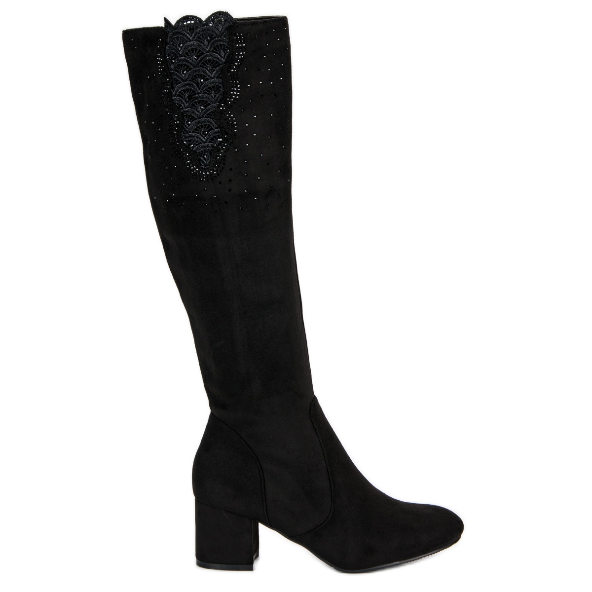 As botas pretas são caracterizadas por um cabedal lindamente decorado, que chama a atenção com uma renda sutil na parte superior, complementada com delicados cristais. Este detalhe confere-lhes um charme e sofisticação únicos, tornando-os a escolha ideal para ocasiões especiais para mulheres que valorizam o bom gosto e o estilo moderno.