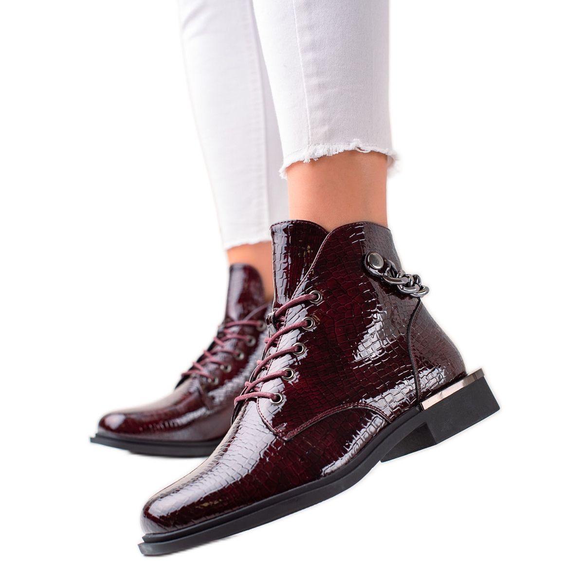 Elegantes botins de couro envernizado da Sergio Leone na linda cor bordô são a escolha perfeita para mulheres que desejam combinar estilo com conforto. Perfeitos tanto para o uso diário como para ocasiões especiais, estes botins enquadram-se perfeitamente num estilo casual e elegante.