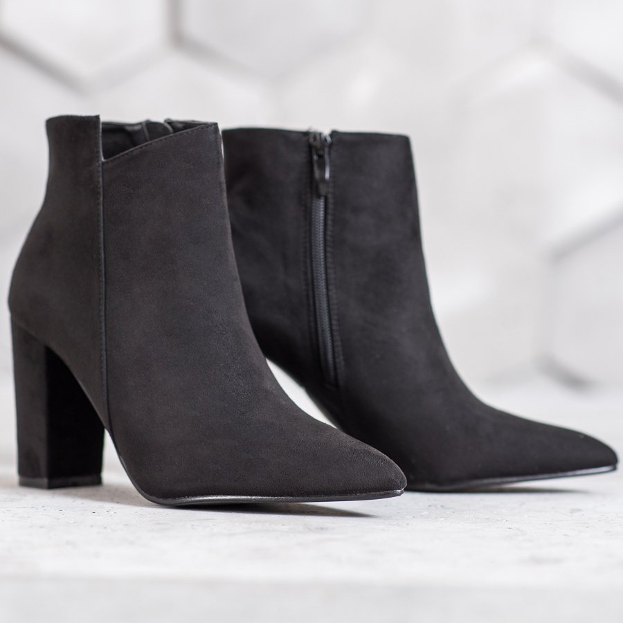 Confeccionados em couro ecológico em imitação de camurça, os botins na cor preta universal combinam perfeitamente com qualquer look. O salto alto em bloco de 9 centímetros não apenas alonga opticamente as pernas, mas também garante estabilidade e conforto de uso. Uma vantagem adicional é o fechamento com zíper, que facilita a colocação e a retirada do calçado.
