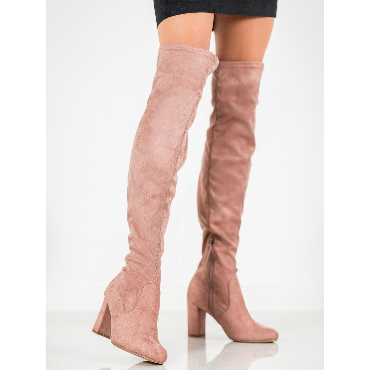 Detalhes: Corina Botas elegantes sobre o joelho rosa