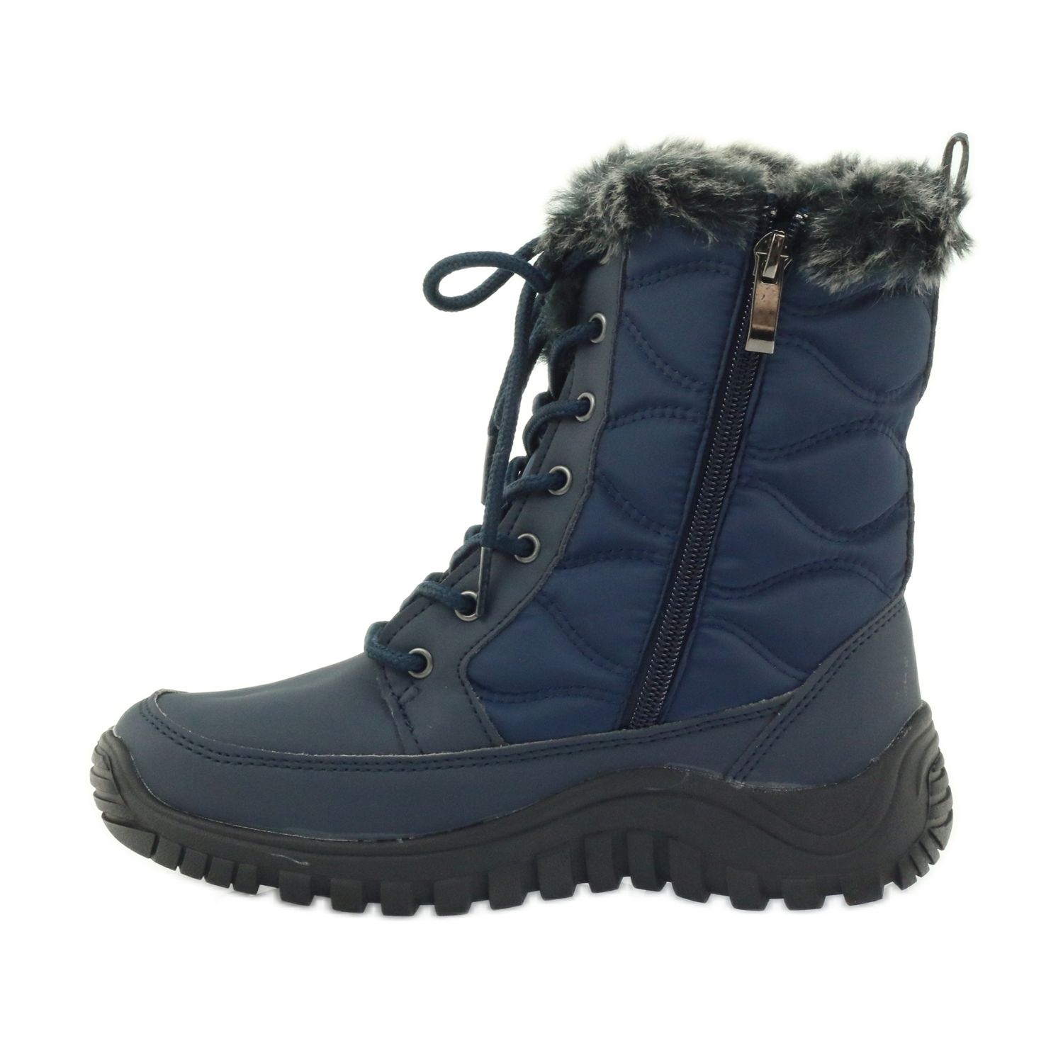 A interessante parte superior confere personalidade aos sapatos, tornando-os um complemento perfeito para qualquer estilo de inverno. As botas de neve são equipadas com fecho de cadarço e zíper adicional, o que facilita a colocação e o ajuste à perna. Graças à altura do salto de 3,5 cm e à sola de borracha, caminhar com este calçado é confortável e estável.