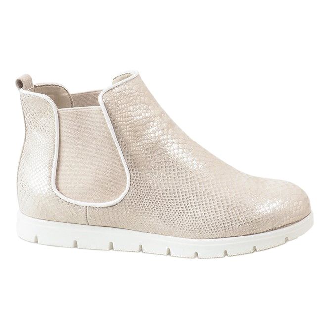 Descubra elegância e originalidade com as botas desportivas douradas 1602 em tons de bege e prata! Estas botas Chelsea extremamente elegantes, perfeitas para mulheres que querem se destacar na multidão, combinam perfeitamente design moderno com conforto de uso.