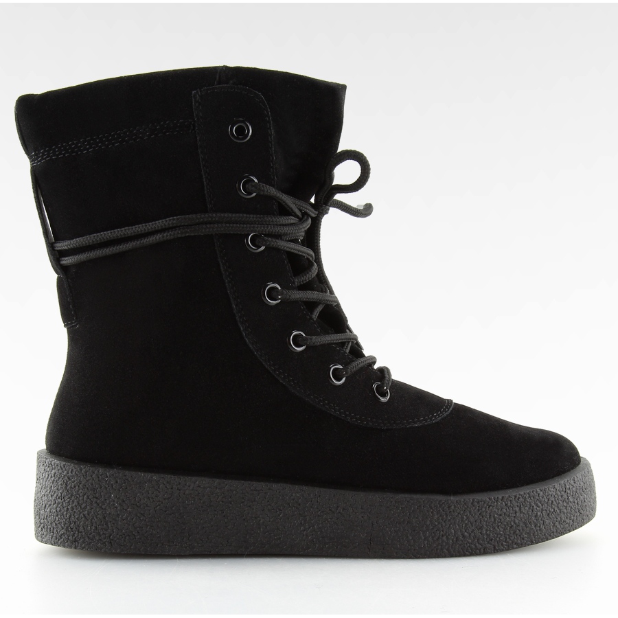 Botins clássicos femininos pretos com carácter desportivo, perfeitos para o uso diário. Confeccionados inteiramente em camurça ecológica, com forro de espuma macia - proporcionam calor e conforto mesmo em temperaturas mais baixas. Uma sola sintética sólida e alta isola eficazmente do frio e adiciona estabilidade ao caminhar.