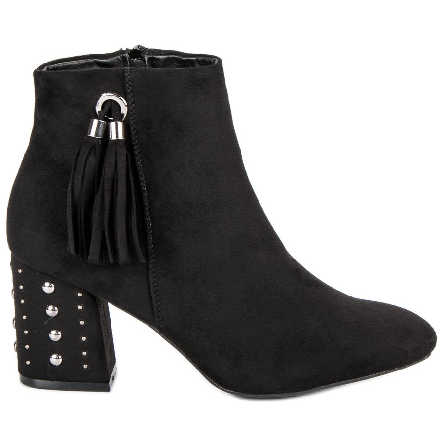 O diferencial destas botas são as impressionantes franjas colocadas na lateral, que lhes conferem um gume acentuado, e tachas de vários tamanhos que decoram o calcanhar. O salto de 7,5 cm de altura não só alonga opticamente as pernas, mas também garante estabilidade e conforto de uso. A biqueira redonda permite liberdade de movimentos, tornando estes sapatos a escolha perfeita para qualquer ocasião - desde passeios diários até passeios noturnos.