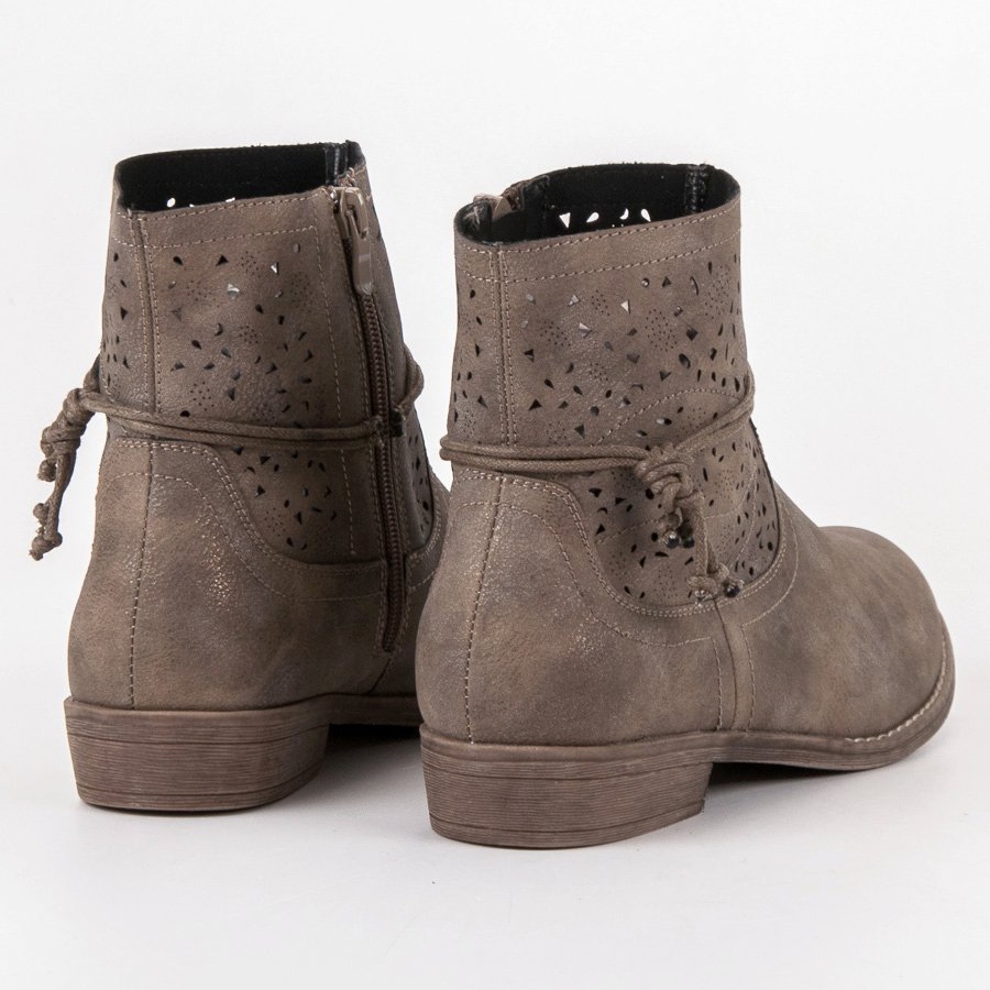 Um elemento característico dessas botas é o cabedal vazado, que confere leveza e originalidade. Um cordão no tornozelo permite ajustar o calçado às suas necessidades individuais, enquanto o zíper no lado esquerdo facilita a colocação e a retirada. As botas têm salto baixo e plano de 3 cm de altura, o que as torna muito confortáveis de usar, perfeitas para o uso diário.