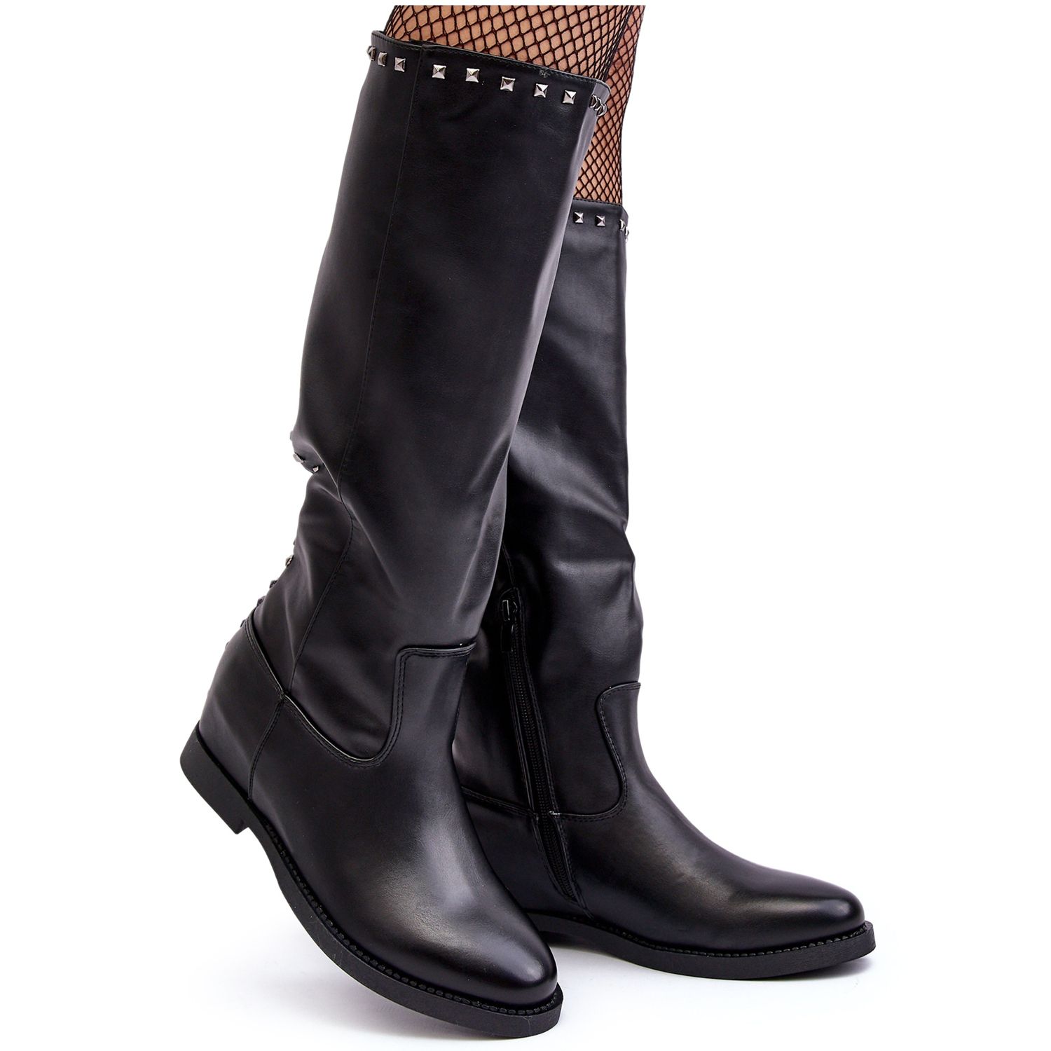 Botas elegantes e confortáveis em frente ao joelho feito de couro ecológico - perfeito para a temporada de outono/inverno. Um modelo com um corte clássico, incorporado em um salto baixo e plano (2 cm), com uma parte superior decorativa acabada com pregos de metal. A estrutura inserida facilitou com uma trava curta adicional na parte inferior da parte superior.
