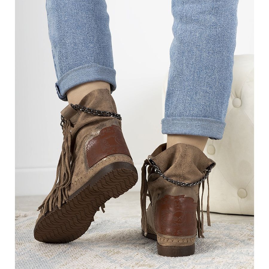 Apresentamos botins Maral femininos na cor bege, que combinam perfeitamente o estilo boho com o conforto do dia a dia. Confeccionados em couro camurça ecológico de alta qualidade, esses botins encantam pela leveza e elegância. Decorados com uma corrente metálica e franjas da moda, complementam perfeitamente qualquer estilo outono-inverno, conferindo-lhe um carácter requintado.