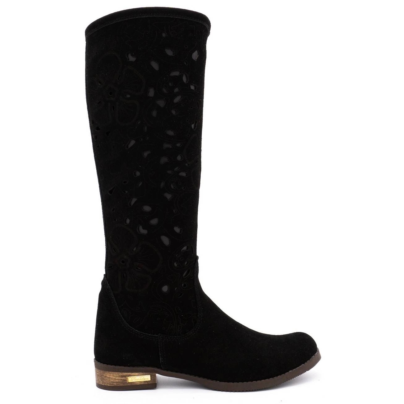 Botas femininas elegantes feitas de couro natural (Nubuk/Suede) - uma combinação de conforto e uma decoração sutil. O modelo "Flowers" é distinguido por um padrão aberto, geométrico e floral na parte superior, o que adiciona leveza e faz com que os sapatos se misturem bem com estilizações de primavera e outono.