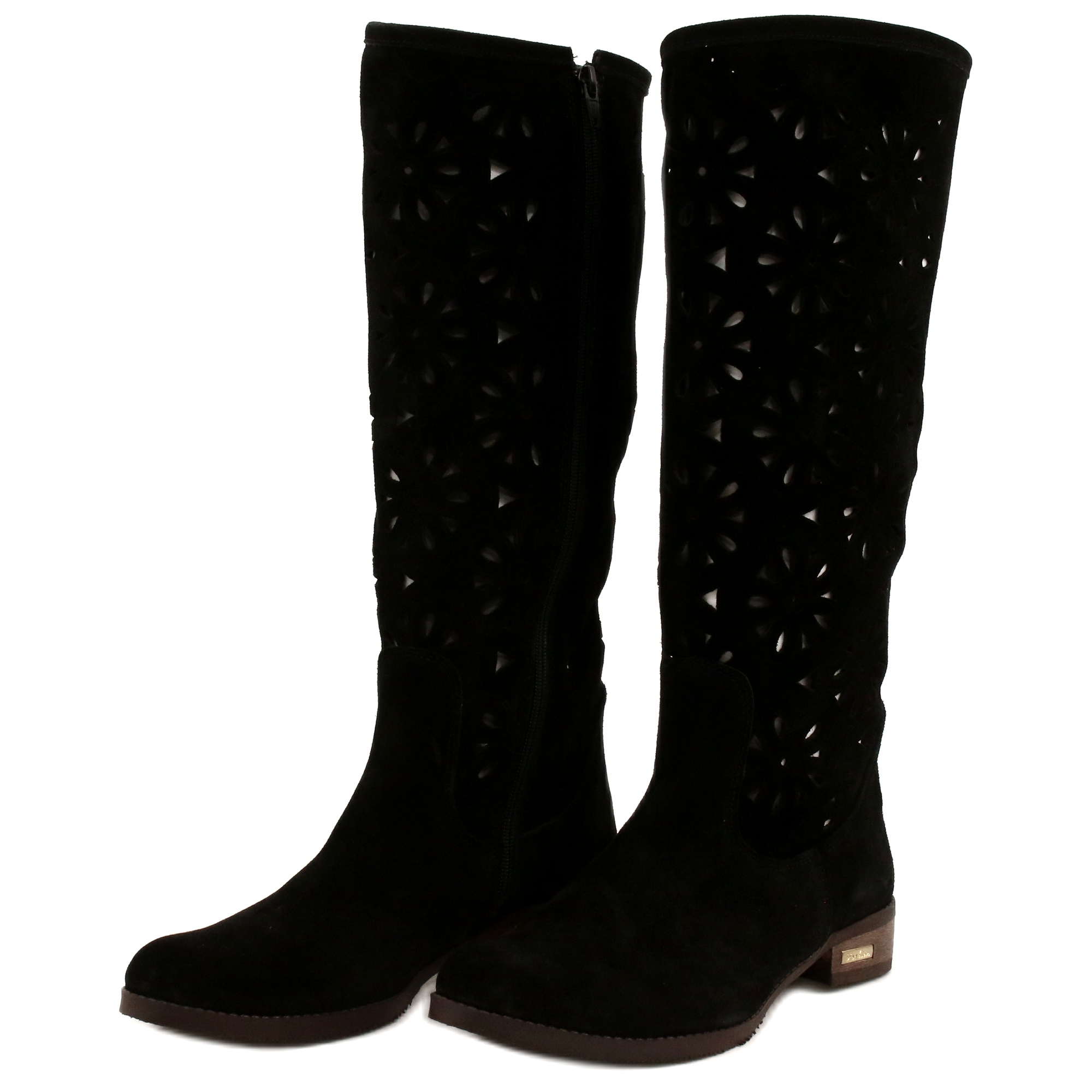 Botas femininas elegantes, leves e confortáveis de Olivier - perfeitas na primavera e no outono. Feito de couro natural (Nubuk / Suede), agradavelmente macio e facilmente se adaptando à perna. A parte superior da parte superior é decorada com um padrão aberto, geométrico e floral, que oferece aos sapatos um caráter feminino e elegante.