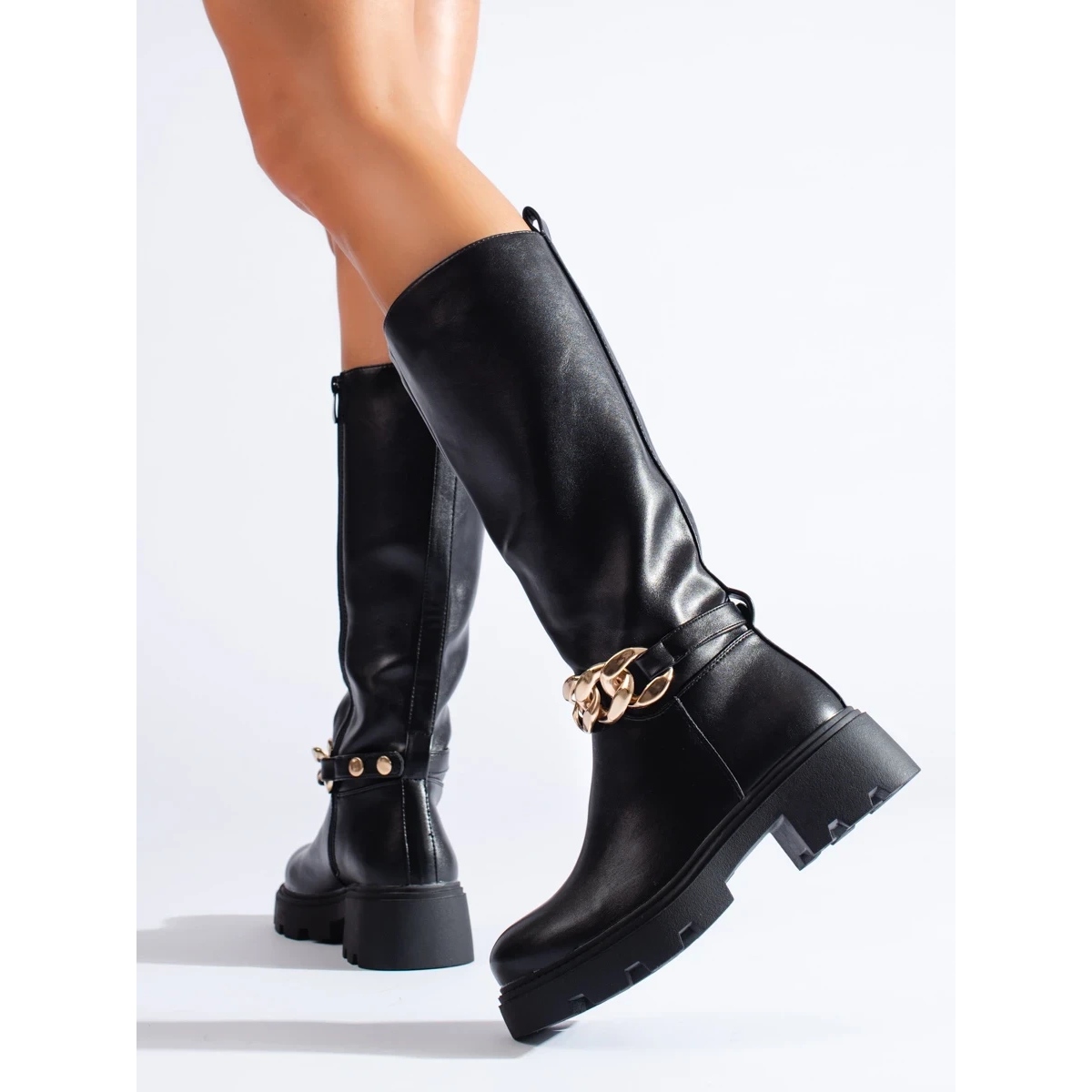 Botas femininas sobre o joelho com uma corrente - couro preto e ecológico