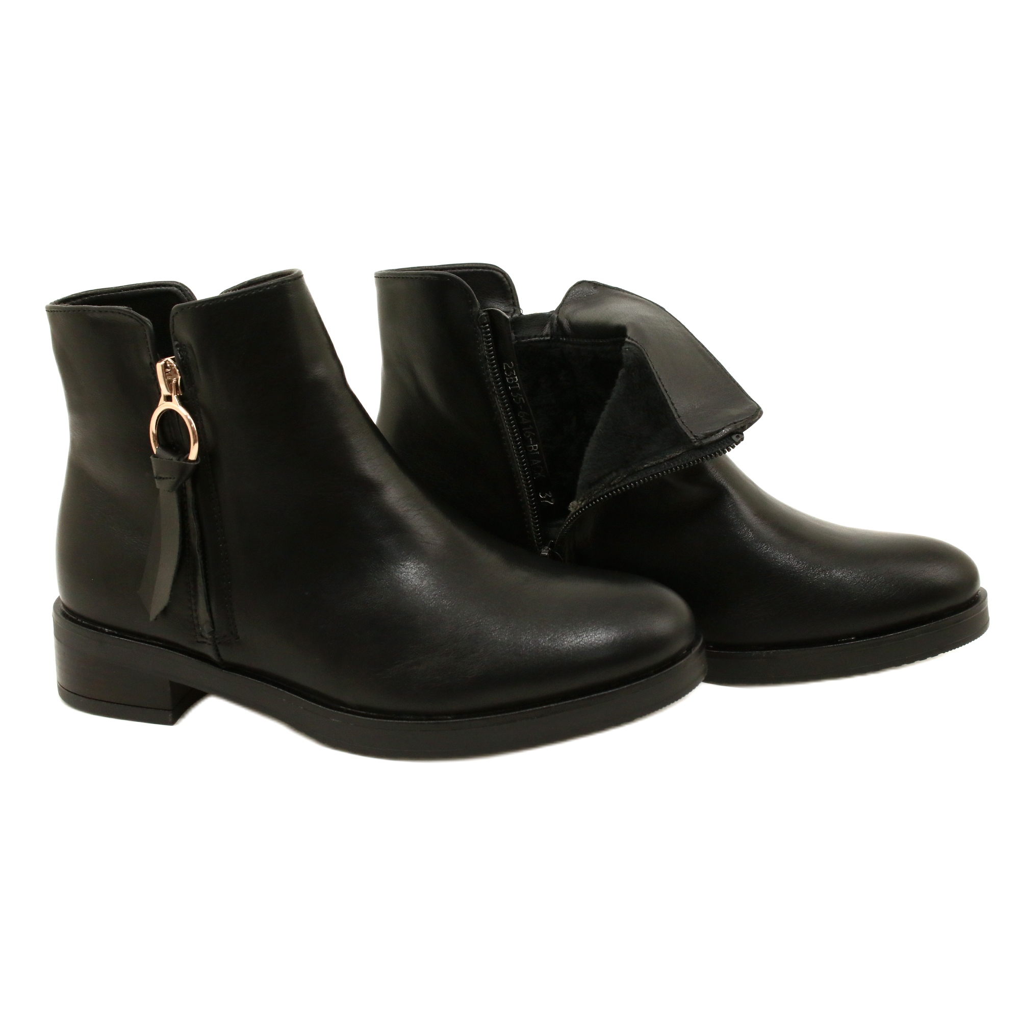 Jaquetas clássicas feitas de couro ecológico em preto profundo com um sotaque delicado e dourado. O Modelo 23BT35-6416 combina um corte atemporal com soluções práticas: um salto baixo e plano (3,5 cm) oferece conforto durante o uso do dia inteiro, e a fixação do zíper facilita a inserção rapidamente. Decorações laterais sutis e um controle deslizante decorativo adicionam estilo sem perturbar a linha de calçados minimalistas.