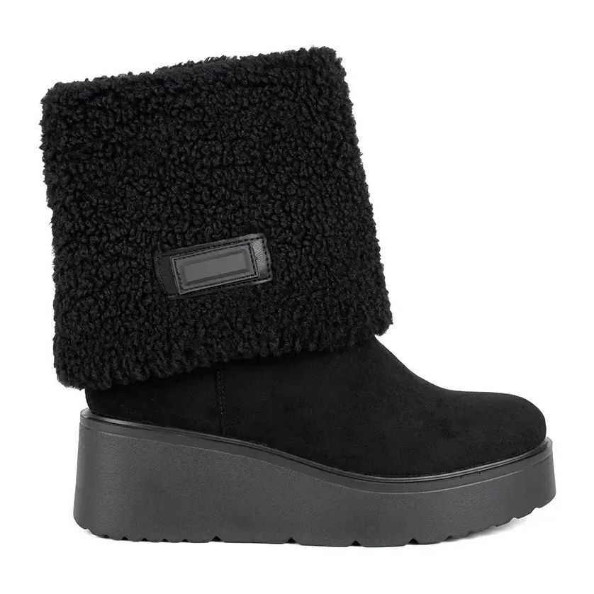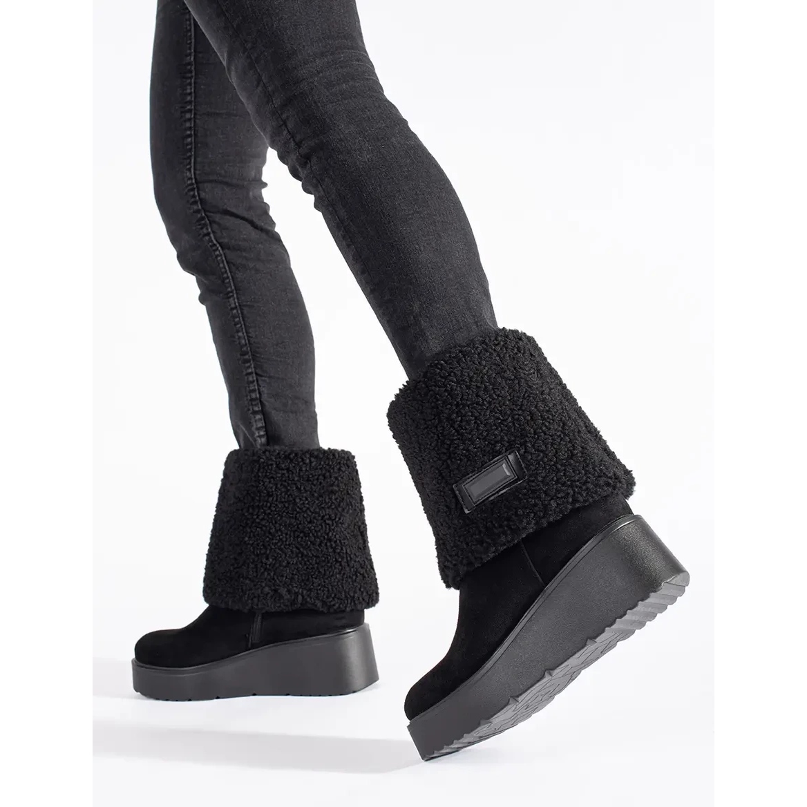 Projetados para mulheres, essas botas são distinguidas por um salto de up construído, o que garante estabilidade e conforto de desgaste. Feito de couro ecológico de camurça, eles parecem elegantes e são ecológicos. O interior das botas isoladas é um pêlo agradável que protege efetivamente os pés do frio, ideal para o outono e o inverno.