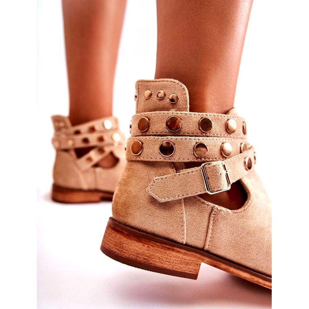 Botas elegantes que combinam conforto com um brilho sutil. Feito de camurça ecológica em um tom bege universal, decorado com strass nas tiras e nas costas da parte superior e equipado com recortes práticos nas laterais - perfeitas todos os dias e para estilizações mais refinadas.