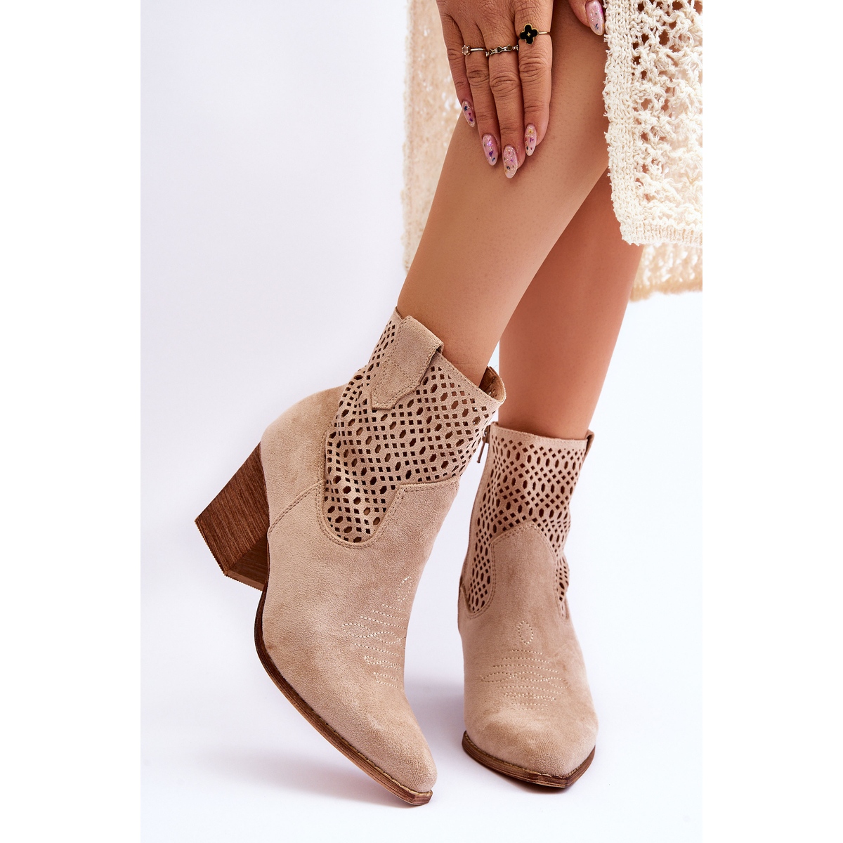 Descubra as extraordinárias botas cowboy femininas de camurça FB1, que combinam perfeitamente o estilo clássico com um acabamento moderno. Estes botins bege de salto alto são a escolha perfeita para todas as mulheres que querem se destacar na multidão. O cano superior é confeccionado em camurça ecológica, decorado com padrão vazado e costuras sutis na frente, o que lhes confere um caráter único.