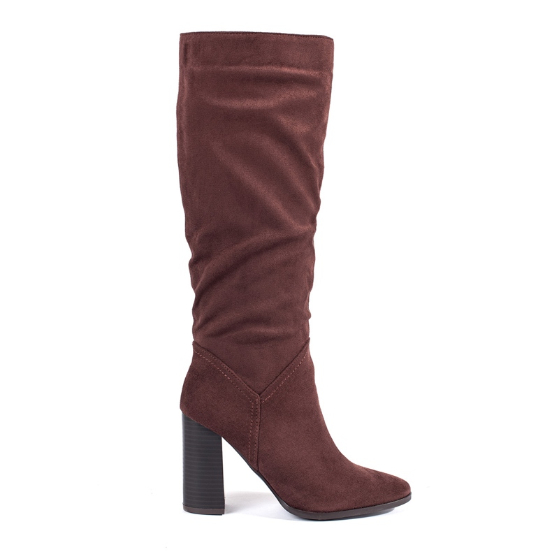 Detalhes: Botas femininas de camurça marrom com salto alto acima do joelho