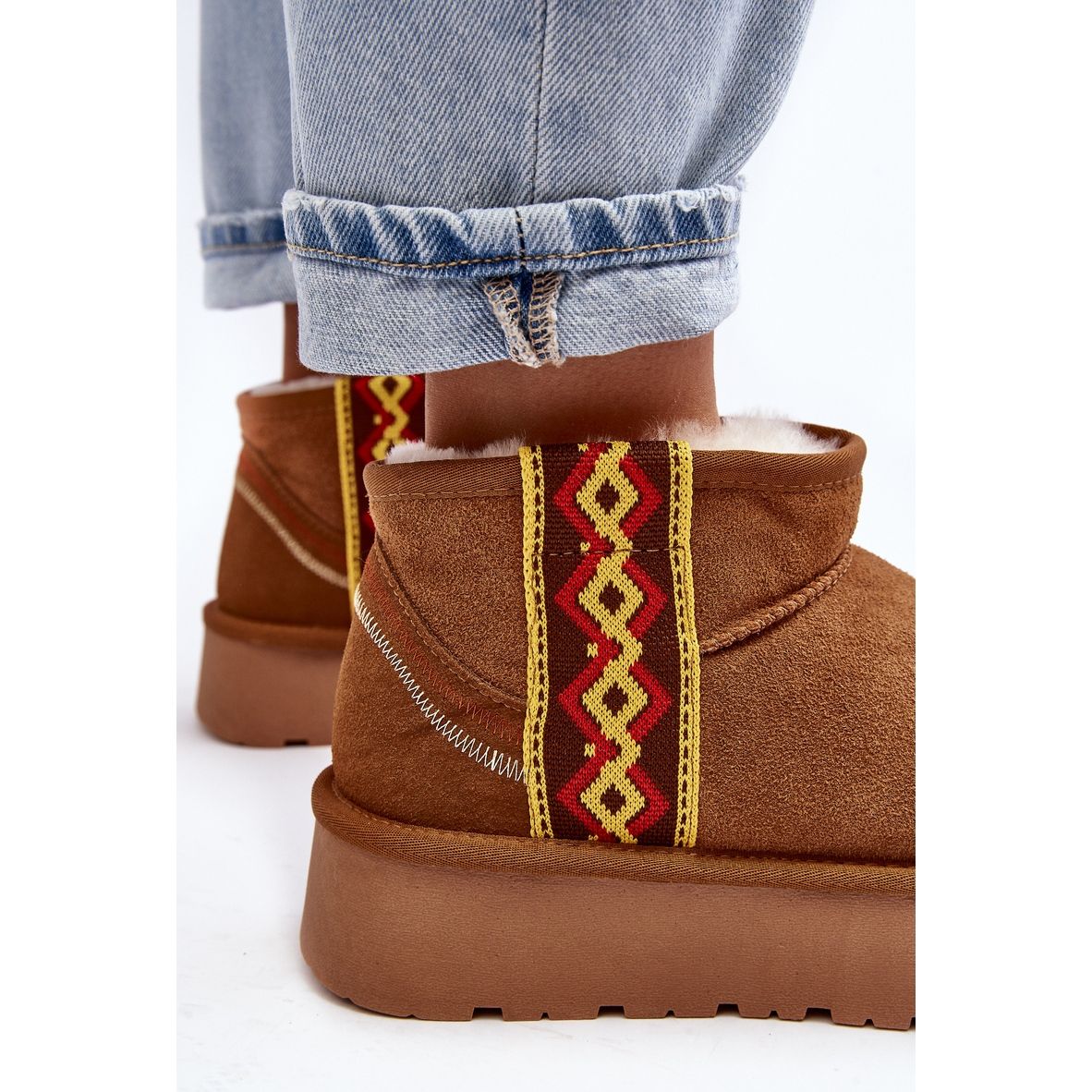 A principal vantagem destas botas de neve é que são feitas de camurça natural, o que não só acrescenta elegância, mas também é um material durável e resistente a danos. A cor castanha do calçado, tanto na parte superior como na sola, é universal e cabe perfeitamente no guarda-roupa de inverno, sendo também uma escolha muito prática.