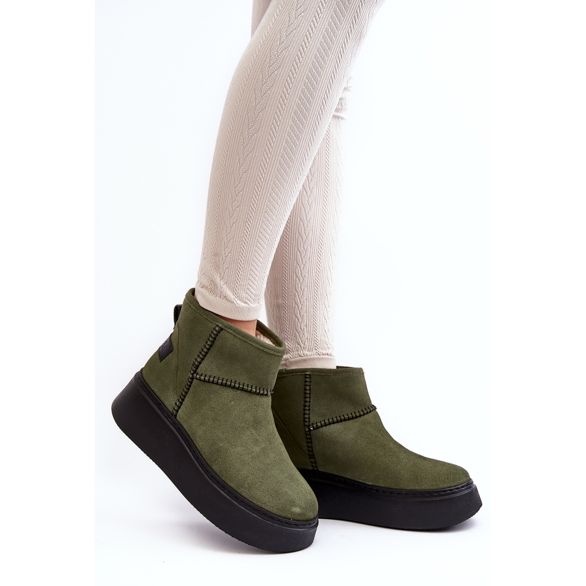Botas de neve elegantes e quentes de Maciejka, feitas de couro natural de camurça em um tom de azeitonas na moda com detalhes em preto. Perfeito para dias frios - o interior isolado com uma camada de pele de ovelha macia oferece conforto térmico, e o calcanhar rígido estabiliza o pé. Situado em uma enorme plataforma de borracha com uma altura de 6,5 cm, eles combinam conveniência com uma aparência universal urbana. Modelo escorregado, sem padrões - atemporal e fácil de combinar com muitos estilos.
