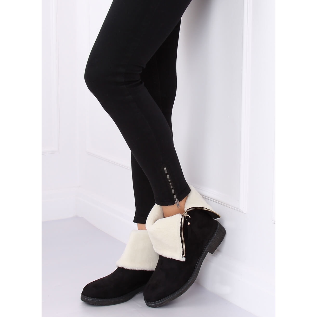 Os botins femininos S118 Black são a escolha perfeita para os dias gelados, aliando estilo e conforto. Confeccionados em camurça ecológica na elegante cor preta, estes botins isolados certamente chamarão a atenção pelo seu design original. Um elegante zíper dourado e pele saindo da parte superior não apenas adicionam personalidade aos sapatos, mas também proporcionam calor adicional.