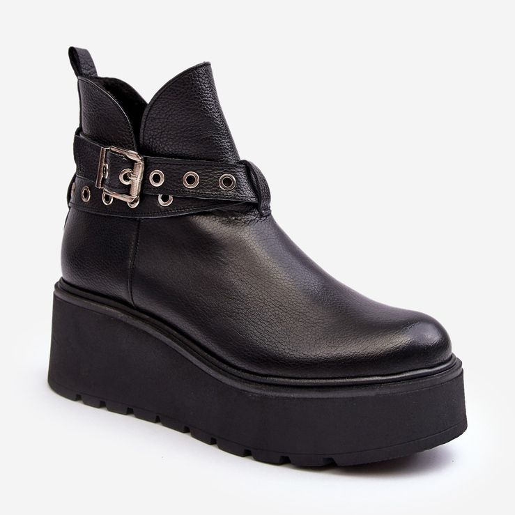 Botas elegantes e práticas, feitas de couro natural de alta qualidade. Situado em uma cunha estável de 7 cm com uma plataforma enorme, ideal para dias mais frios - isolada com um cobertor de sapatos e equipada com uma inserção suave, proporcione conforto ao longo do dia. A parte superior chega ao tornozelo e listras decorativas com um caractere de fivela. O fixador de zip facilita a instalação.