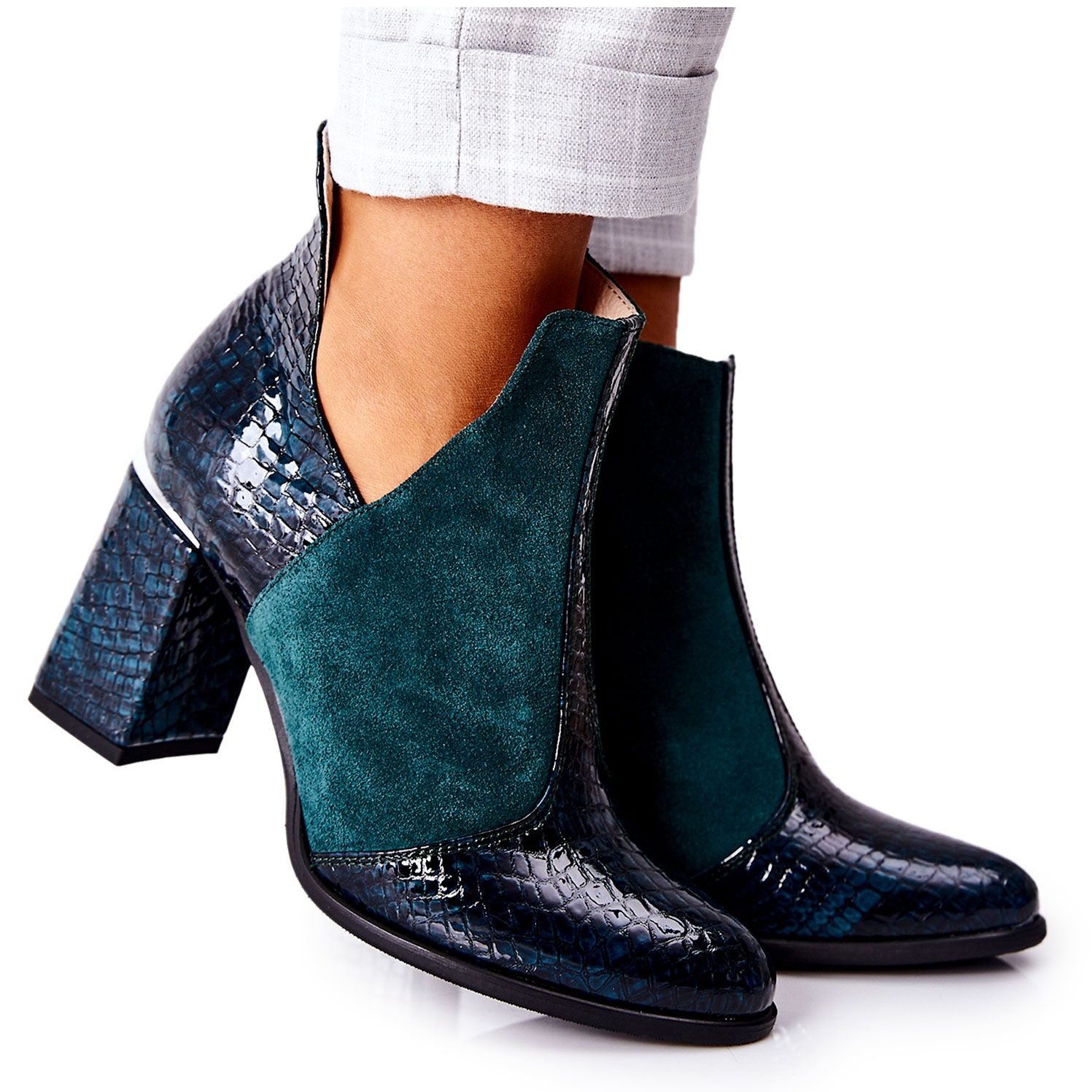 Descubra estilo e conforto únicos com botins femininos de couro PA2 em um tom verde moderno. Estas botas clássicas encantam com uma combinação de camurça natural e couro de grão superior, que imita a elegante pele de crocodilo, conferindo-lhes um caráter predatório e um visual extraordinário.