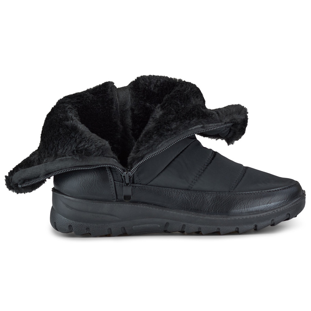 O zíper facilita a colocação e a largura padrão permite ajustá-lo a qualquer pé. Botas de neve pretas com material externo de náilon e forro de tecido têm uma aparência elegante e seu design universal faz com que combinem com muitos looks de inverno.