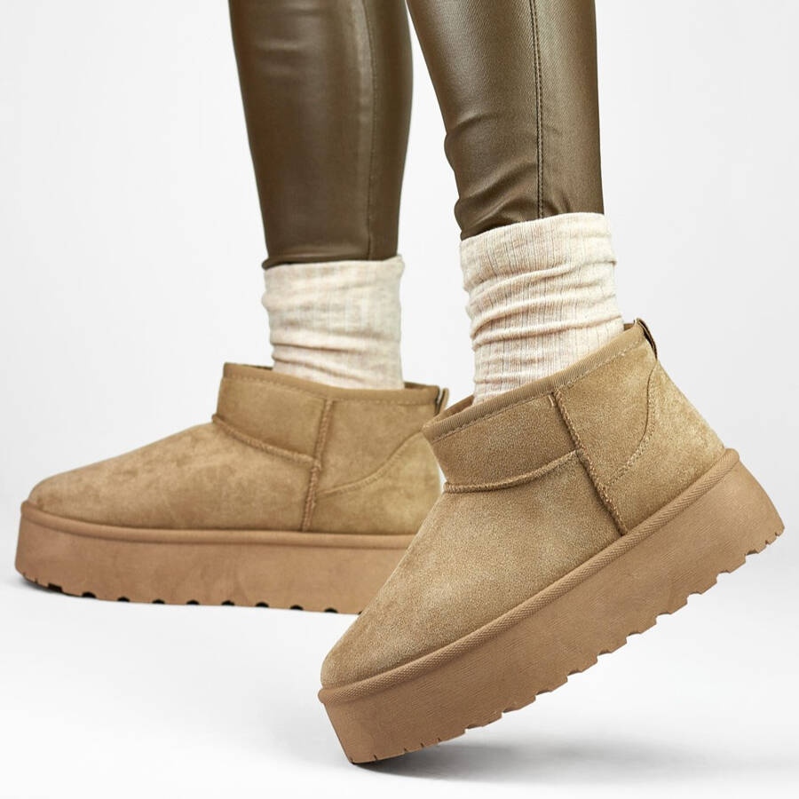 Botas de neve femininas na plataforma em escuro bege tl242-kh é a escolha perfeita para dias frios. Feito de camurça ecológica, eles fornecem não apenas uma aparência elegante, mas também conforto de uso. A altura da parte superior de 9 cm e a largura padrão de 19 cm se adaptam perfeitamente à perna, e o nariz redondo lhes dá charme.