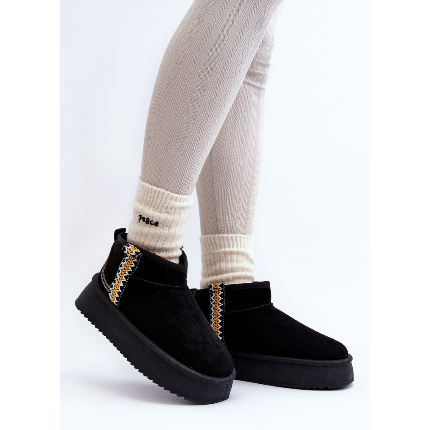 Descubra a última tendência de inverno com as botas de neve das mulheres negras na plataforma! Feito de camurça ecológica de alta qualidade, esses sapatos são uma combinação perfeita de estilo e conforto. Uma sola grossa de borracha fornece excelente isolamento de um terreno frio, o que os torna uma escolha ideal para dias frios.