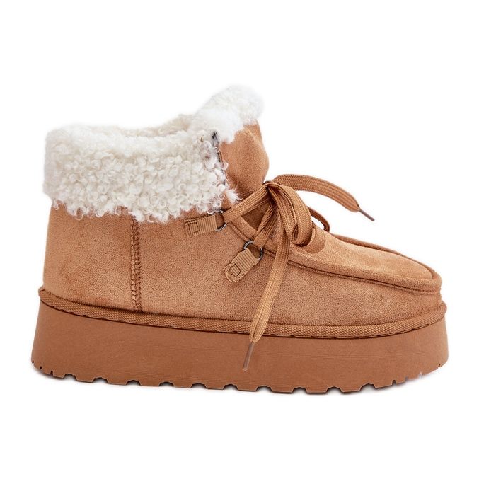 As botas de neve femininas na plataforma com camel cabelas pêlo são uma ótima opção para os dias de inverno, combinando a elegância com conforto. Feito de camurça ecológica, esses sapatos marrons não apenas parecem bonitos, mas também fornecem proteção total contra terrenos frios, graças ao isolamento em uma plataforma confortável com uma altura de 3,5 cm.