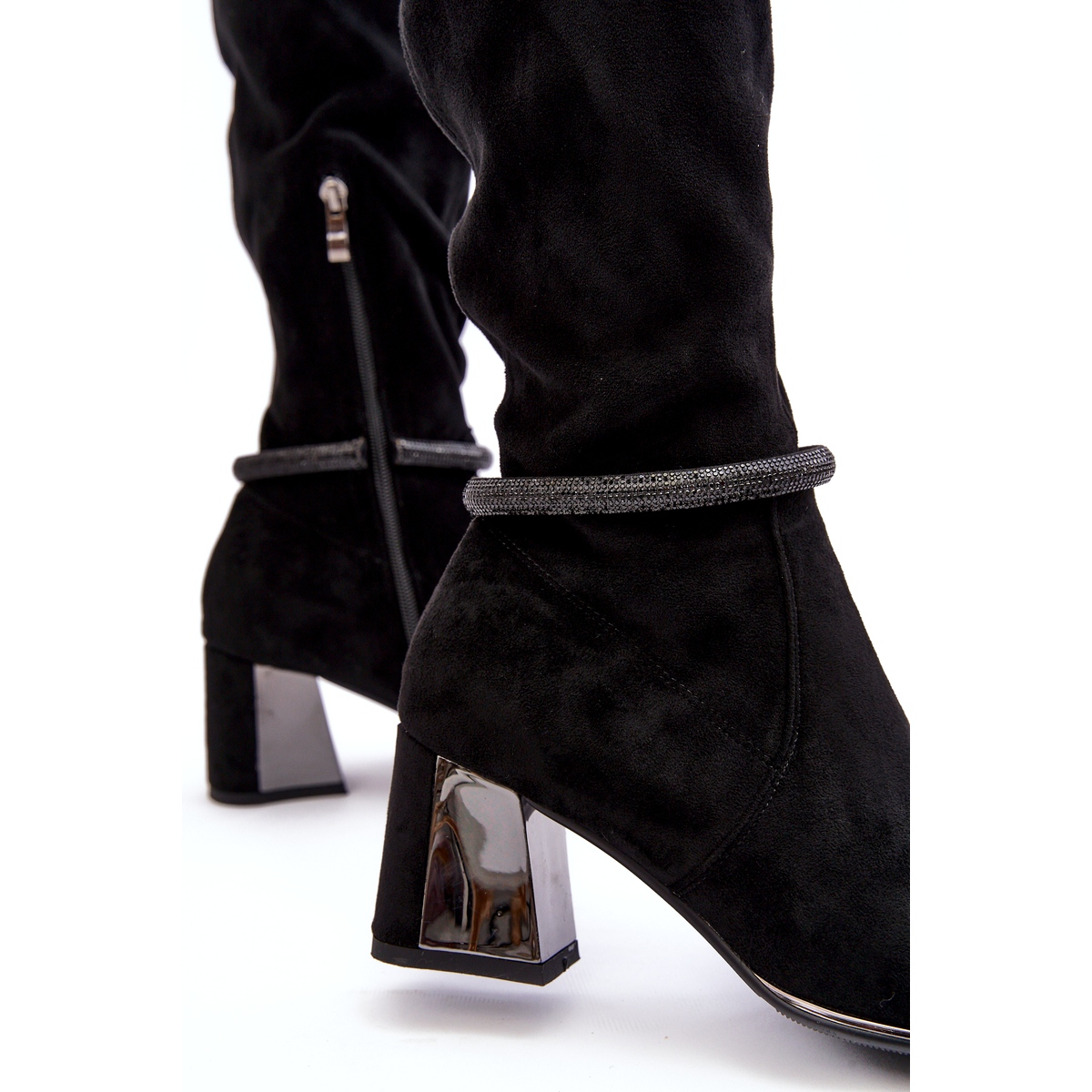 As botas são distinguidas por um salto de 7 cm de altura, o que garante estabilidade e conforto ao usar. O nariz de emagrecimento opticamente no Spitz adiciona estilo e elegância, e a parte superior alcance sobre o joelho, parcialmente presa com o zíper, enfatiza efetivamente as pernas.