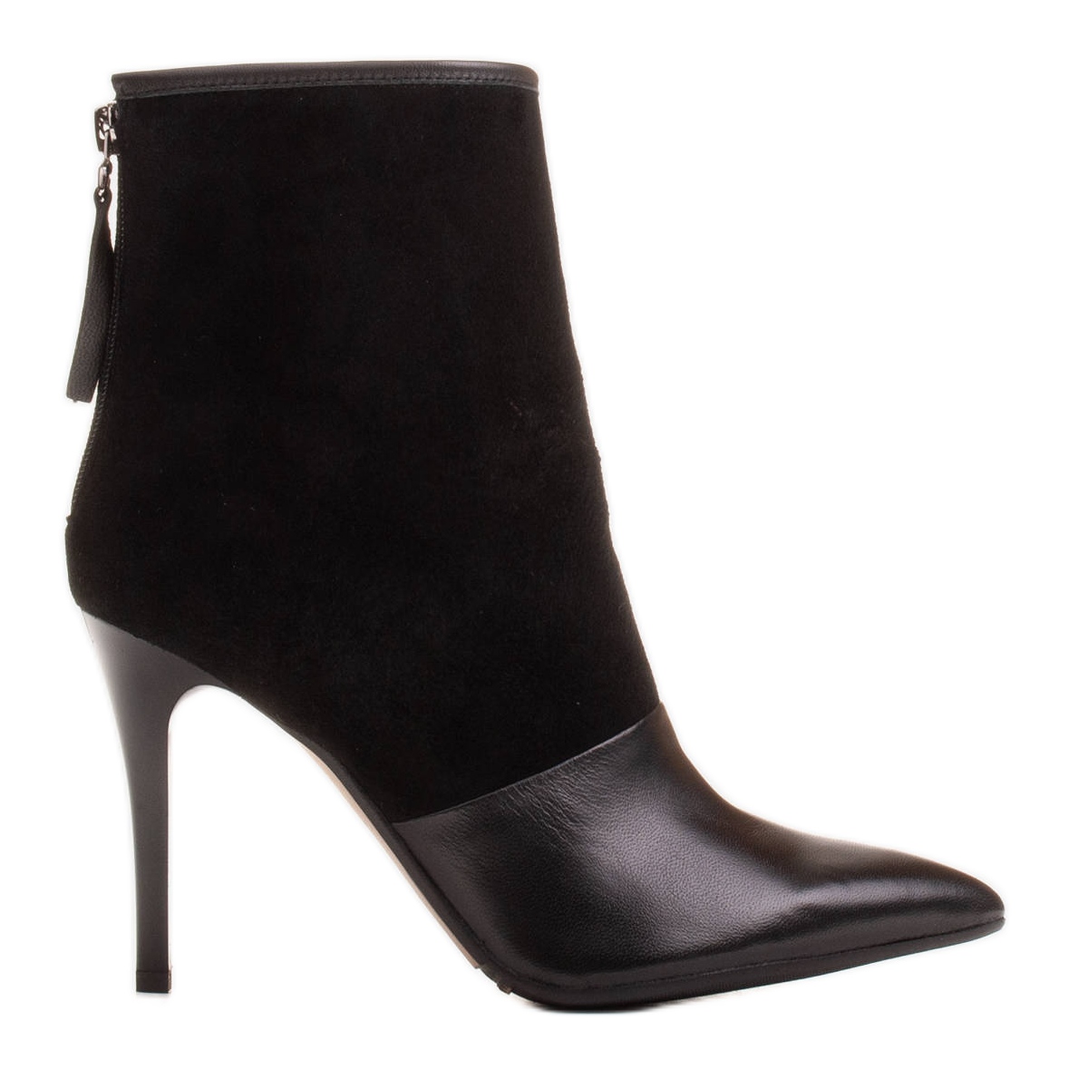 Apresentamos um modelo confeccionado com os melhores materiais: a combinação de couro de grão natural e camurça delicada é garantia de qualidade e aparência única. O preto - clássico indiscutível da moda mundial - é aqui utilizado na versão mais universal e elegante, o que faz com que estas botas combinem perfeitamente com vários elementos do guarda-roupa - desde fatos de negócios a vestidos de noite e conjuntos mais casuais.