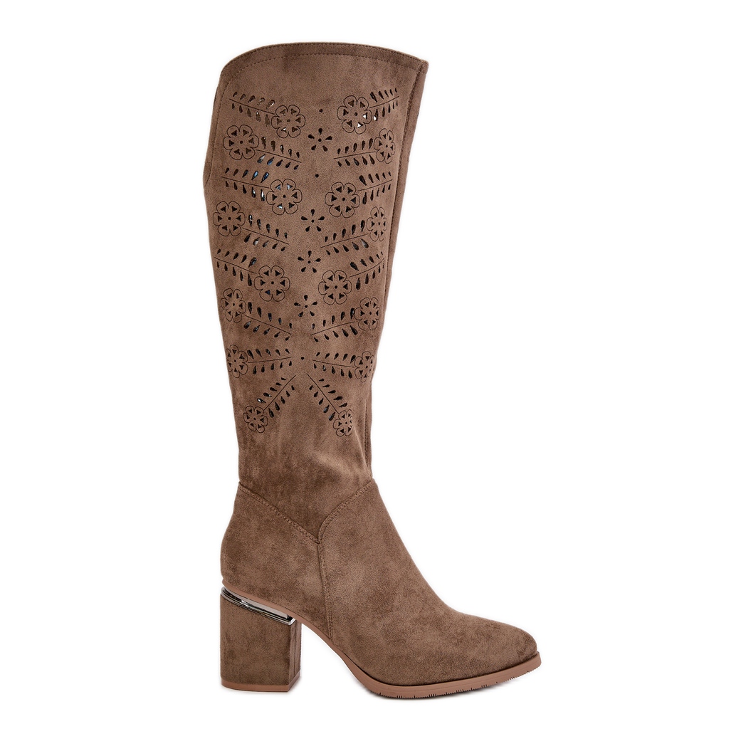 Detalhes: Botas femininas de salto alto perfurado em camurça ecológica Vinceza 16443 bege escuro
