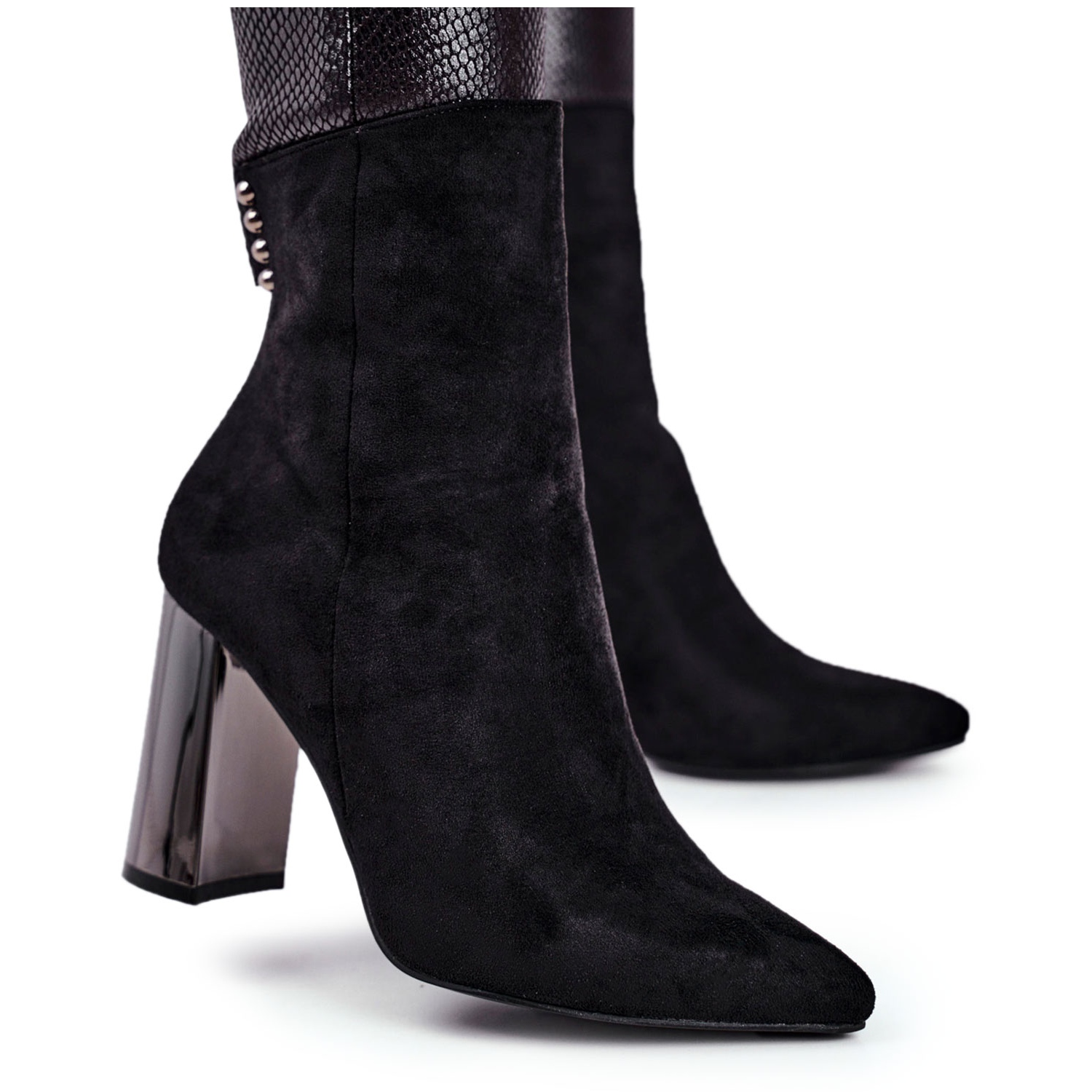Descubra botins femininos exclusivos de salto alto em uma estilosa cor preta, que são novidades na coleção KeeShoes. Feitas em camurça ecológica de alta qualidade, essas botas não só têm um visual elegante, mas também garantem conforto de uso. O salto espelhado de 9,5 cm de altura confere-lhes um carácter moderno e o espigão estável garante segurança ao caminhar.