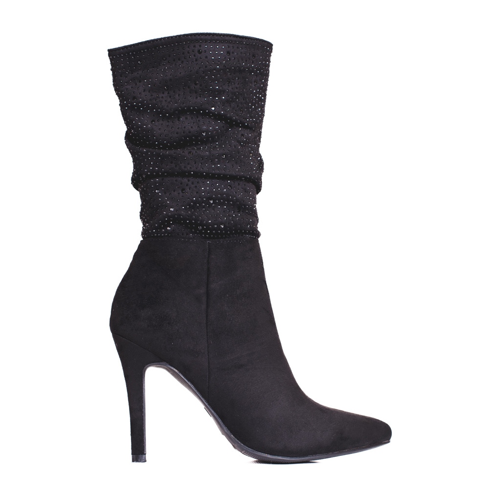 As botas têm salto alto em forma de salto agulha de 10 cm de altura, o que confere elegância e alonga opticamente as pernas. A biqueira redonda e o salto embutido com reforço fazem com que os sapatos caibam bem na perna, e as decorações adicionais em forma de zircões e strass conferem-lhes um caráter único.